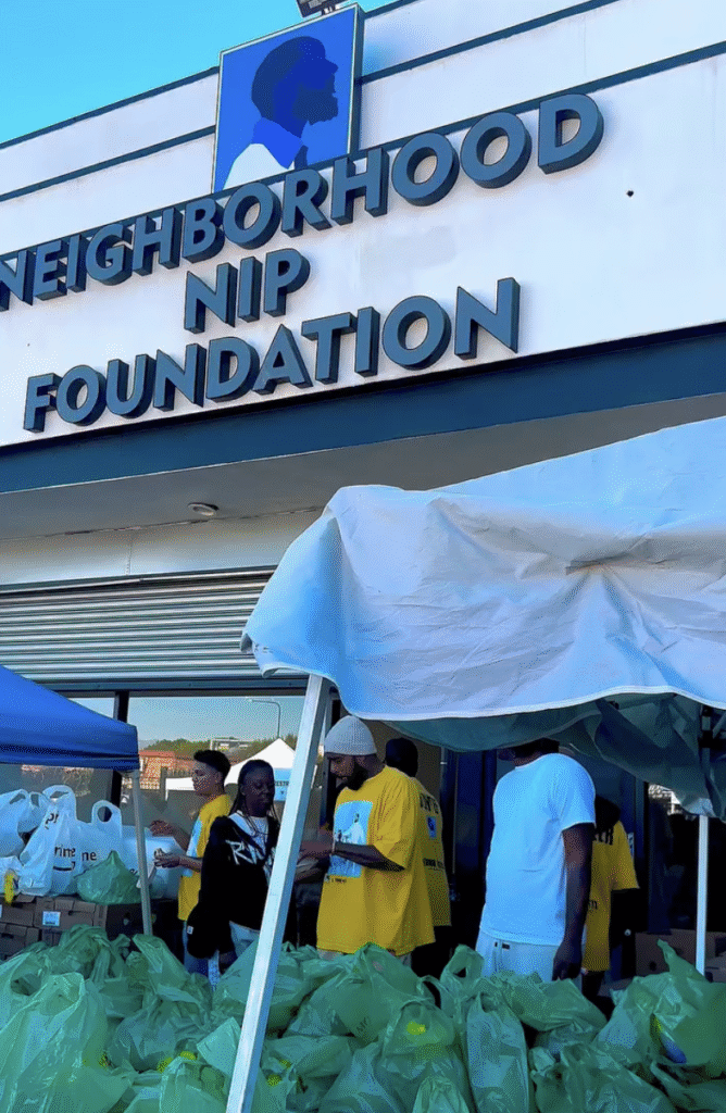 Los Angeles, CA–The Neighborhood Nip Foundation hosted its first Turkey Drive at the intersection of Crenshaw Boulevard and Slauson Avenue, providing Thanksgiving meals and resources to hundreds of South Los Angeles families. The event marks a significant step in reactivating the property that once housed Nipsey Hussle’s original Marathon Clothing store, which had been closed and fenced off for six years.