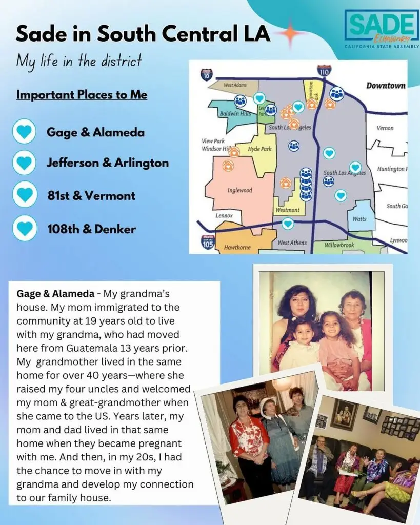 Sade’s story is one of resilience and connection rooted in South Central, Los Angeles. With a Guatemalan mother and Egyptian father, she knows what it means to bridge cultures and build unity. In a district that’s 71% Latino and 17% Black, she offers a unique and powerful perspective that can bring together communities that have long shared a common struggle but too often lack a shared advocate.