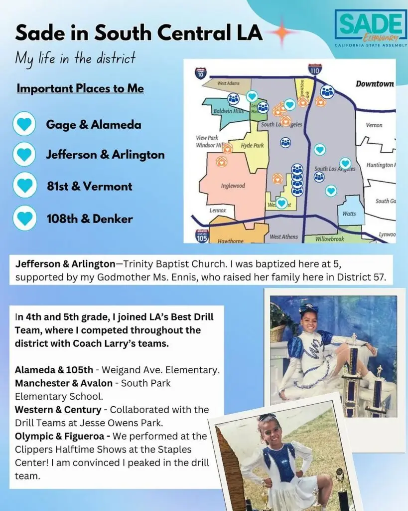 Sade’s commitment to the people of District 57 is unwavering. With high-profile endorsements from influential leaders like Los Angeles Mayor Karen Bass and Supervisor Holly Mitchell, she has shown she’s not only deeply connected to the community but also trusted by those who share her vision for a better Los Angeles. This district—a vibrant stretch that includes parts of South L.A., Florence-Graham, USC, and stretches through downtown from the Crypto.com Arena to Skid Row—needs a representative who won’t back down on the biggest issues. Housing, homelessness, criminal justice reform, and climate change are all at stake, and Sade has the energy and vision to tackle them head-on.