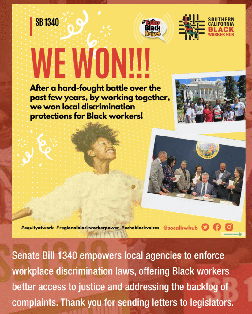 The Southern California Black Workers Hub is a key force in building collective power across Black worker centers including Los Angeles, the Inland Empire, and San Diego. Their mission is building an ecosystem for Black workers to organize for economic opportunity and inclusion in Southern California. The Hub works to coordinate efforts, share resources and align policy/advocacy strategies.